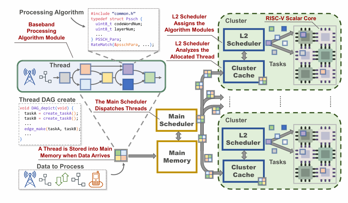ββAt the ACM Turing Award Celebration Conference 2023 - China (TURC β23), we introduced a domain-specific manycore architecture optimized for future 6G baseband signal processing. Built upon RISC-V instruction extensions and a multi-level dataflow programming model, our design achieves moderate performance while offering flexible software programmability. By integrating custom instructions like complex multiplication and parallel shuffle, the architecture accelerates key signal processing tasks and addresses the energy and flexibility limitations of general-purpose processors (GPPs), digital signal processors (DSPs), and field-programmable gate arrays (FPGAs).