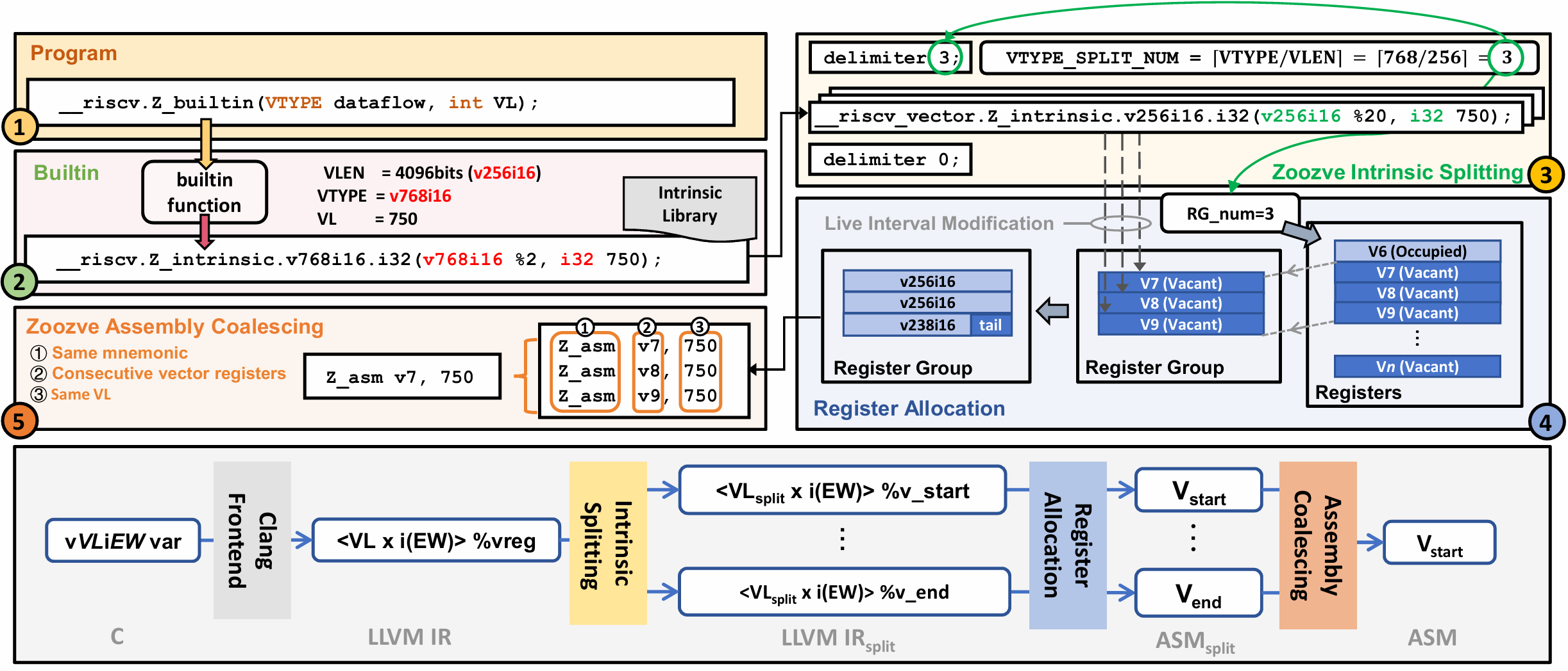 At the 26th ACM SIGPLAN/SIGBED International Conference on Languages, Compilers, and Tools for Embedded Systems (LCTES ‘25), we proposed Zoozve, a novel RISC-V vector extension that eliminates the need for strip-mining in long-vector processing. Zoozve supports arbitrary vector register grouping and features a data-adaptive register allocation strategy, significantly reducing register pressure. Backed by a custom LLVM-based compiler toolchain and SystemVerilog hardware implementation, Zoozve achieves up to 344× reduction in dynamic instruction count in FFT workloads with only a 5.2% area overhead. This advancement opens new directions for flexible and efficient vector computing in wireless and AI domains.